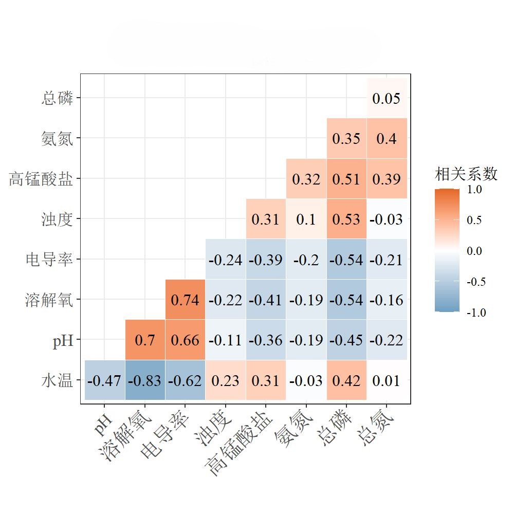 library(ggcorrplot) p<-ggcorrplot(cordata, title=paste0("XX参数相关性"), method = c("square"), type=c("lower"), hc.order = FALSE, outline.col ="white", ggtheme = theme_bw()+theme(plot.title = element_text(hjust = 0.5, size = 16,family="serif")), show.legend=TRUE, legend.title = "相关系数", colors = c("#6D9EC1","white","#E46726"), lab = TRUE, lab_size = 4) p