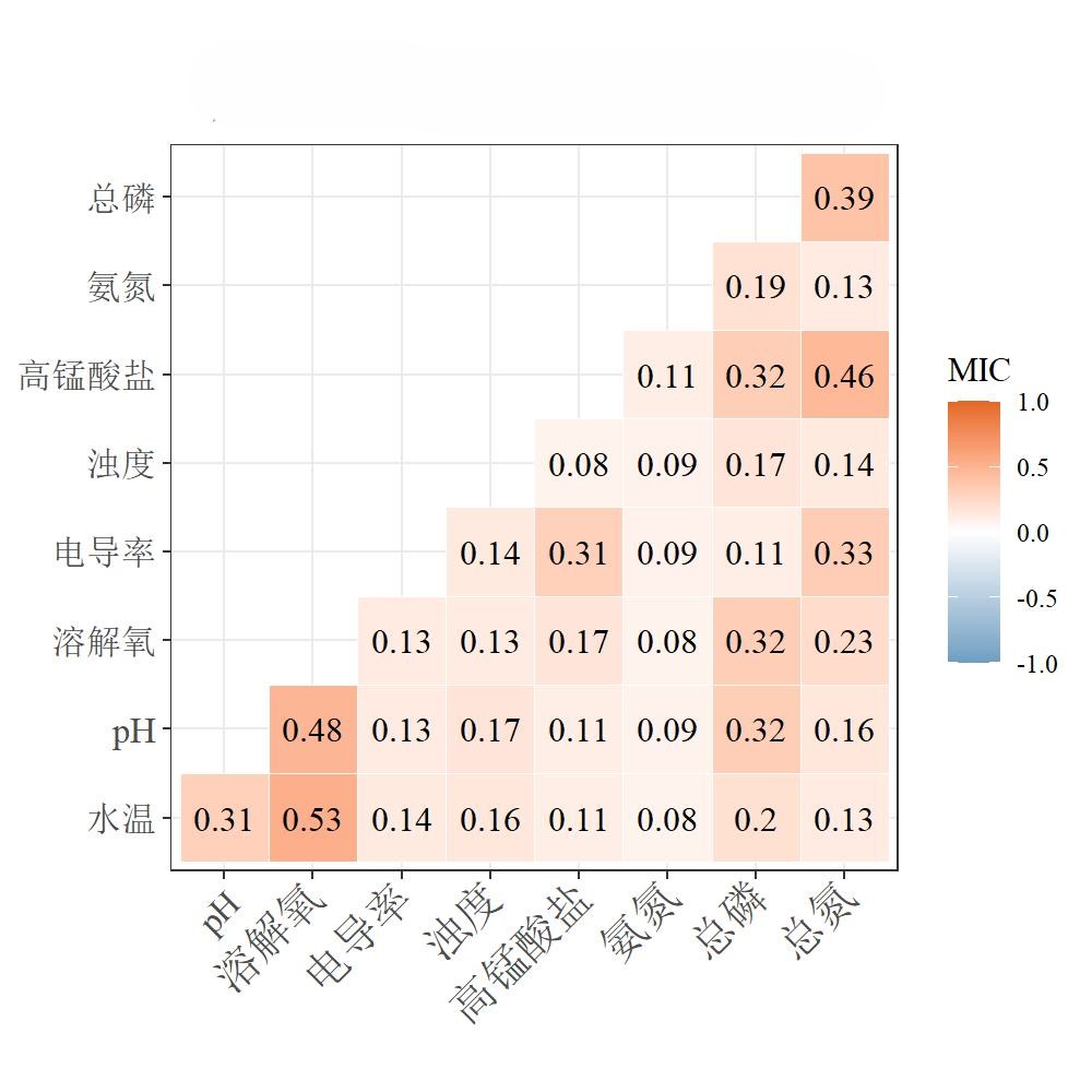 library(ggcorrplot) p<-ggcorrplot(micdata, title="剔除降雨0值各参数最大信息系数", type=c("lower"), hc.order = TRUE, outline.col ="white", ggtheme = theme_bw()+ theme(plot.title = element_text(hjust = 0.5, size = 16)), colors = c("#6D9EC1","white","#E46726"), lab = TRUE, lab_size = 4, legend.title = "MIC" ) p