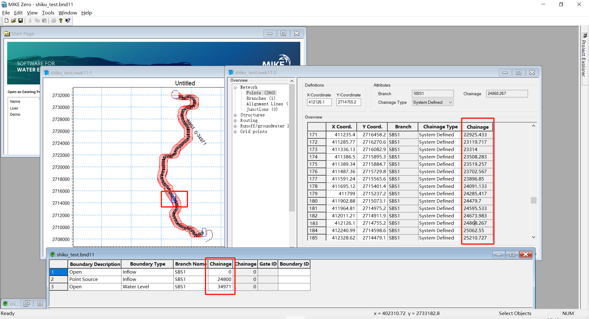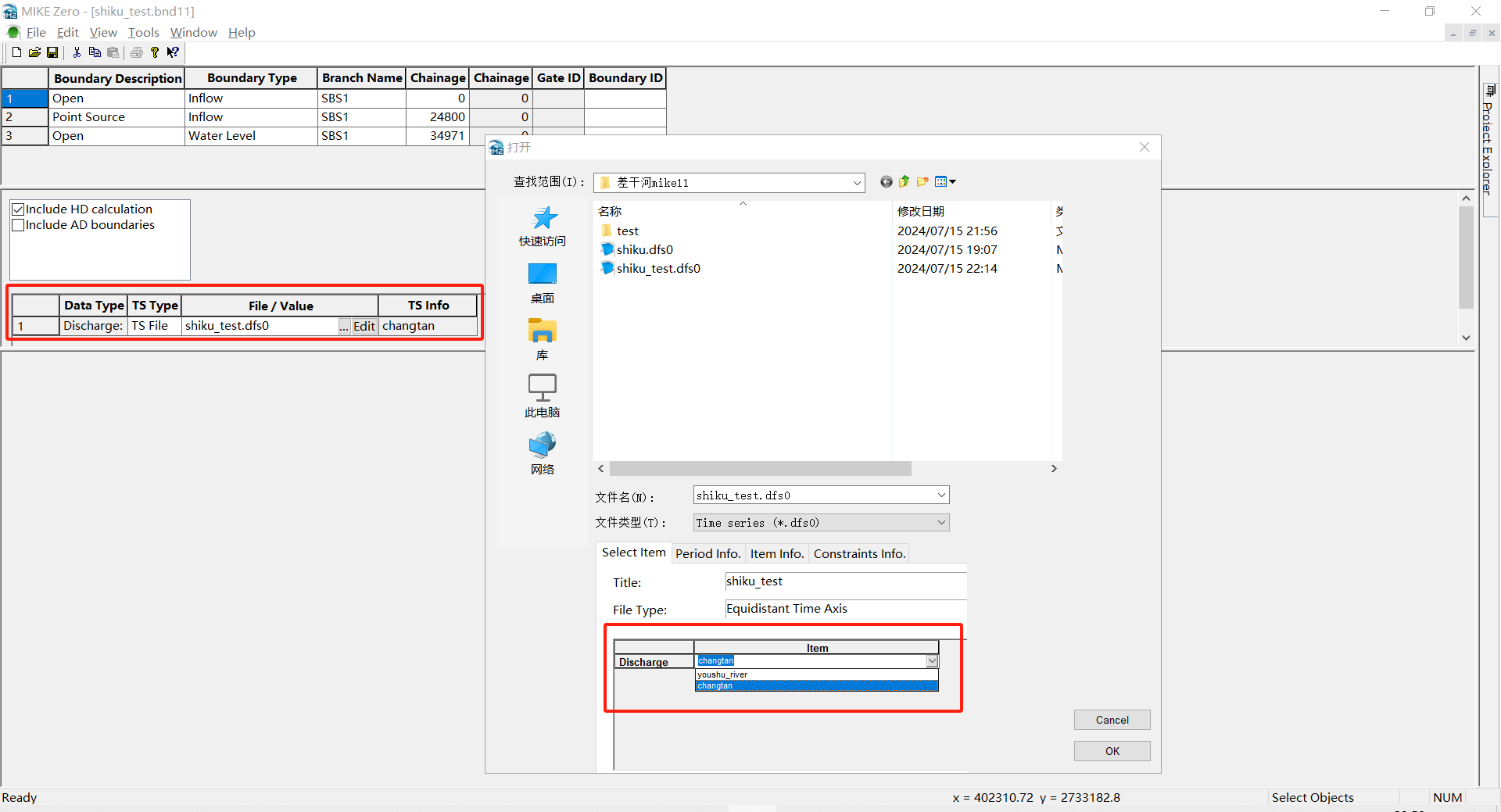一般上下游是流通的,是开边界,支流是汇入的,是点源,设置对应的边界类型、数据类型、河流名称(branch name与之前河网文件(.nwk11)和断面文件(.xns11)一致)、以及支流所在的断面位置chainage(在河网文件(.nwk11)查找,取整)
