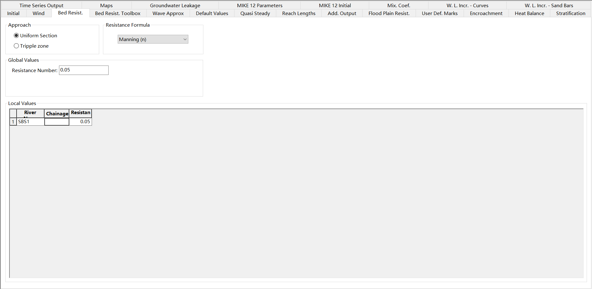 - 主要修改糙率bed resist.,resistance formula改为n,全局设置global values自己调,也可以一个一个断面调local values
