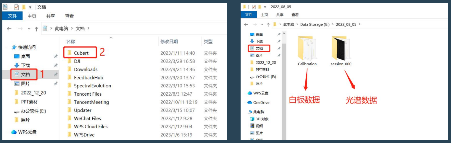 一次正确的光谱获取任务完成后云台会保存拍摄的白板、暗电流照片(保存至Calibration文件夹下)以及拍摄的现场数据(保存至session_000文件夹下)