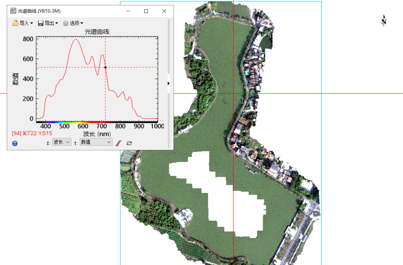 由于拼接后的高光谱图像已经作了一系列图像处理(图像拼接融合、重采样),因此ENVI导出的水体点光谱曲线与X20P相机数据导出中直接用Cubert Utils Touch软件导出的水体点光谱曲线存在偏差,Cubert Utils Touch软件直接对原始图像提取,更符合实际情况且分辨率更高,而后续需通过ENVI对整个水体范围提取光谱曲线,ENVI导出的水体点光谱曲线能保证数据源一致