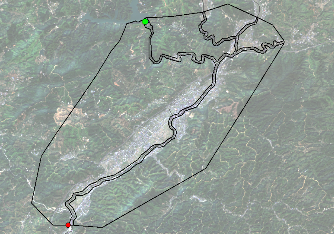 内外shp为一个整体文件,且上下游的连接处重合(shp折点保持一致),保存为投影坐标系(本文保存为CGCS2000_3_Degree_GK_CM_117E)