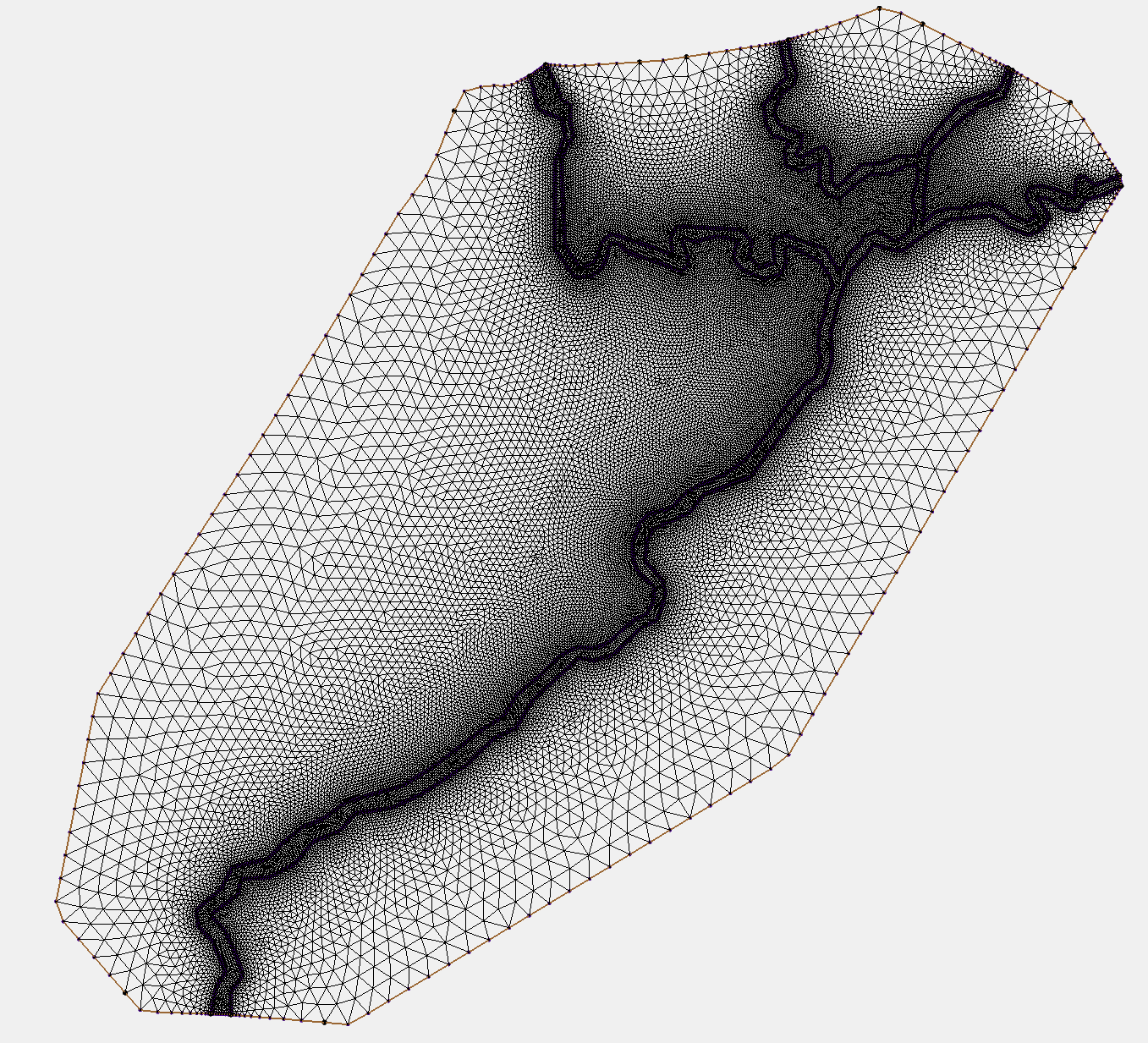 绘制水库下游可能的淹没范围后打网格进行二维洪涝模拟