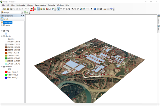 将数据(roads.shp,buildings.shp,river.shp, ortho.tif,dem.tif, water.shp)添加到当前场景中,关闭图层[dem.tif]显示