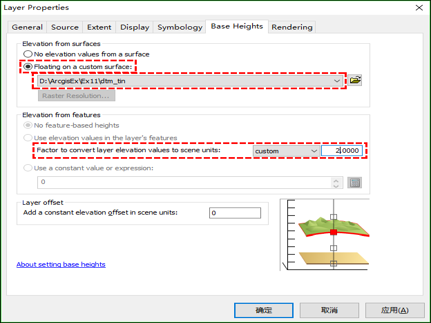 设置遥感影像图层属性ortho.tif,在[Base Heights]选项页中,将高度设置为:[Floating on a custom surface],并选择当前场景中的tif数据图层:[dem.tif],在[Z单位转换]中设定高程的放大系数为 [2],高程将被放大2倍