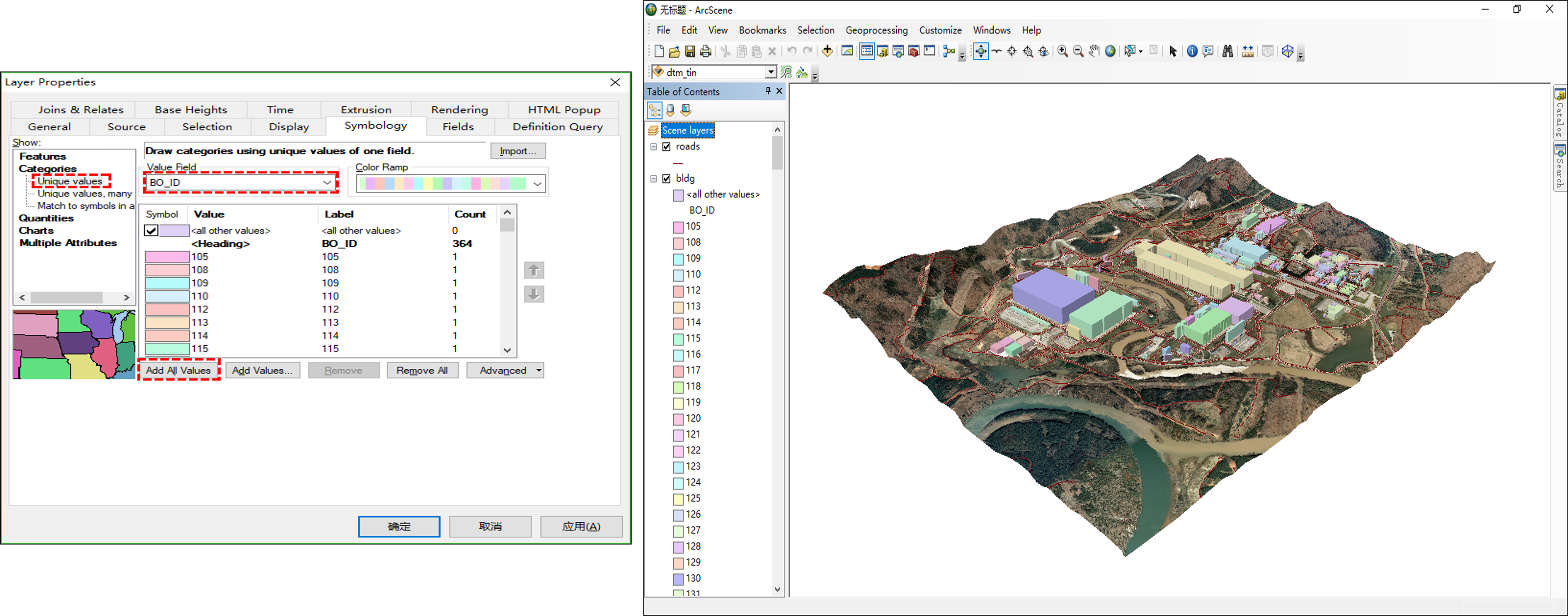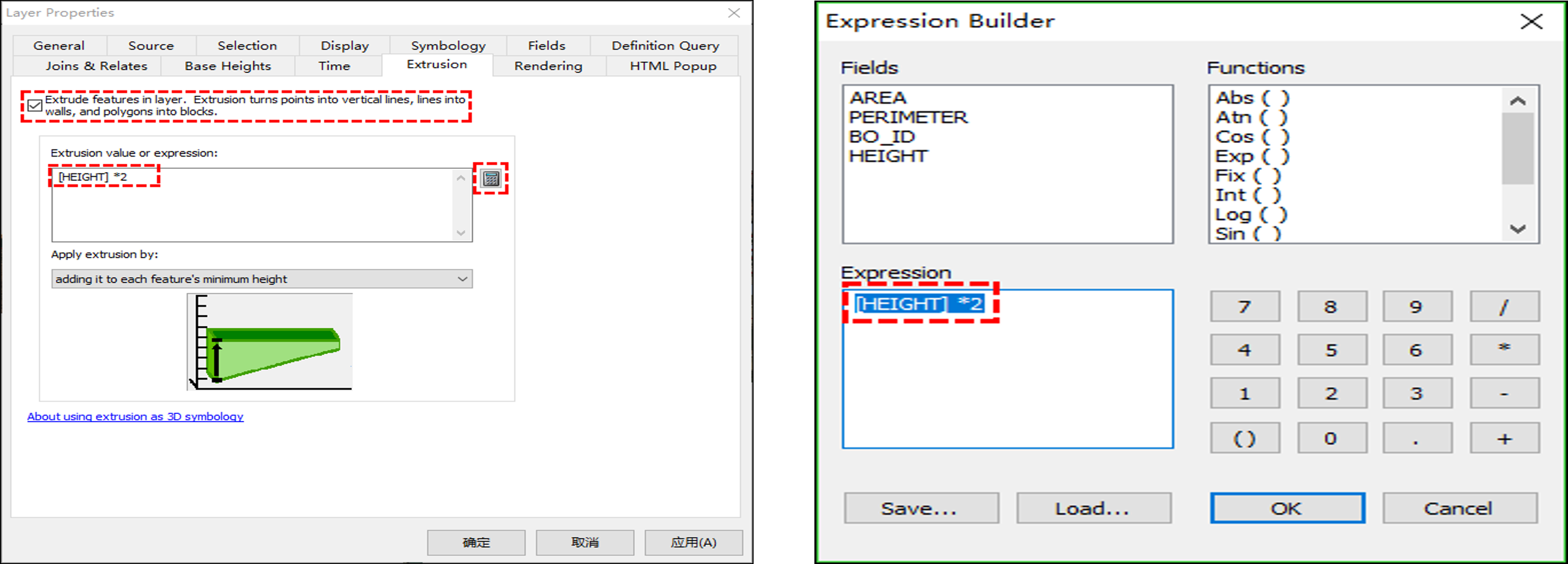 对图层buildings.shp进一步设置 ,[拉伸]选项和[符号]选项。通过设置拉伸表达式为[HEIGHT*2],建筑的高度将根据属性字段[HEIGHT]的数据确定