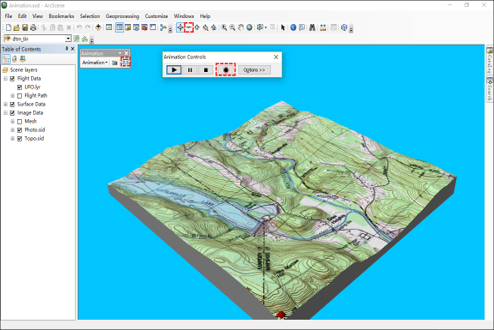 在工具栏显示区点右键,打开[3D分析]、[动画]、[工具] 这三个工具栏;点击[动画]工具栏中的[动画控制]按钮,打开[动画控制]工具栏,点击[动画控制]中的[录制]按钮,在[工具]中选择[飞行]工具;然后在地图显示区中沿任意路线进行飞行(时间建议不要超过30s),然后点击鼠标右键直至停止飞行;点击[动画控制]工具中的停止按钮,停止录像, 点击播放按钮,播放所录的动画。